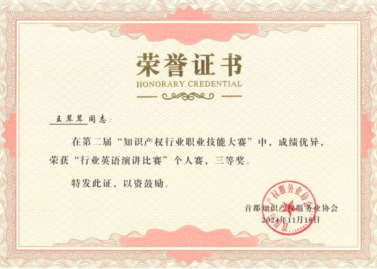 近日,在北京市知识产权局、海淀区市场监督管理局(区知识产权局)的指导下,由首都知识产权服务业协会主办,中国知识产权研究会专利专业委员会、北京(中关村)国际知识产权服务大厅承办的第二届“知识产权行业职业技能大赛”圆满落幕,集佳多位代理人与商标参赛团队在本届大赛中斩获多项佳绩。在“行业英语演讲比赛”个人赛中,何冉冉力战群雄,拔得头筹荣获一等奖,王茸茸、王瑜荣获三等奖;在商标综合技能比赛中,集佳参赛的两支队伍均取得优异成绩,由黎琳、赵敏敏、张雅静三位组成的队伍获得二等奖,由李晴、伍君、曾珍三位组成的队伍获得三等奖。