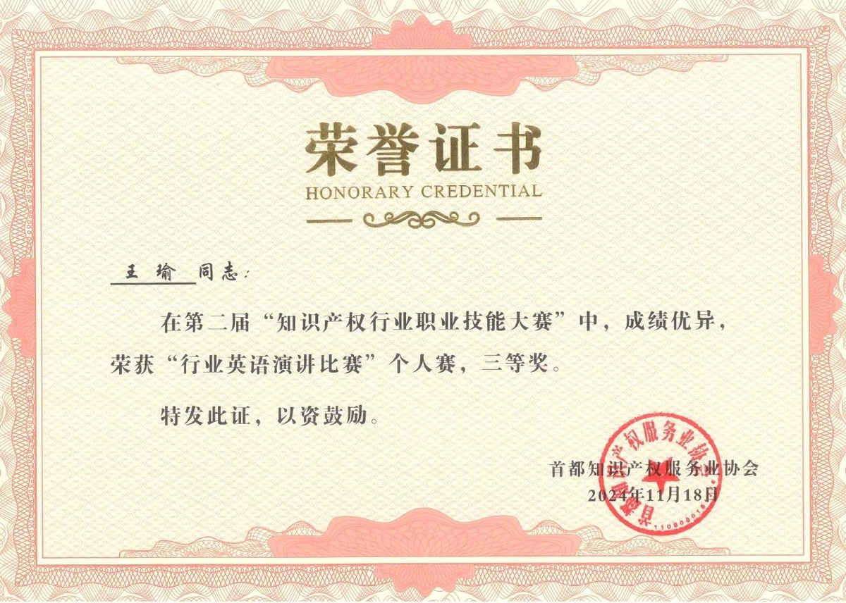 本届大赛以“激扬创新梦想 铸就精彩人生”为主题,秉持公平公正的原则,以展现知识产权人的职业风采、提升知识产权从业人员专业水平、引领知识产权行业向高质量发展为目标,为行业青年人才提供了交流、展示、历练的平台。“行业英语演讲比赛”检验从业人员专业英文口语表达能力;“商标综合技能比赛”检验从业人员商标检索、制定商标确权策略,撰写确权方案的能力。比赛中,集佳参赛选手通过精彩的演讲与答辩,展现了出色的专业能力与良好的团队协作精神,受到评委们的一致好评。